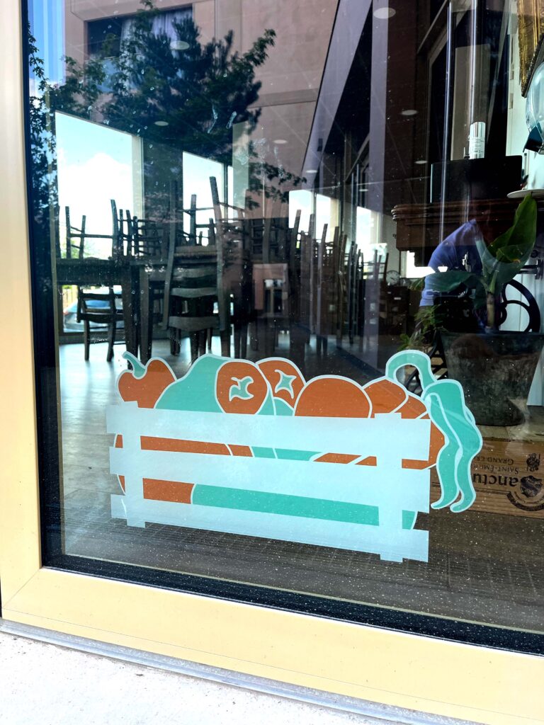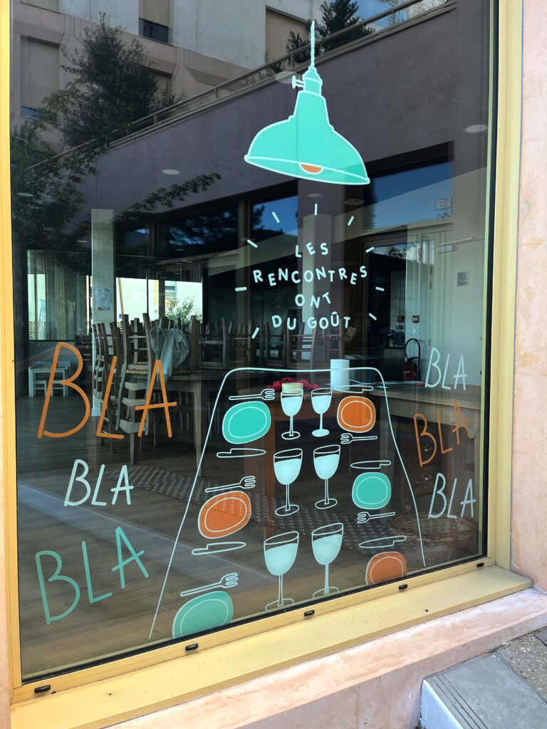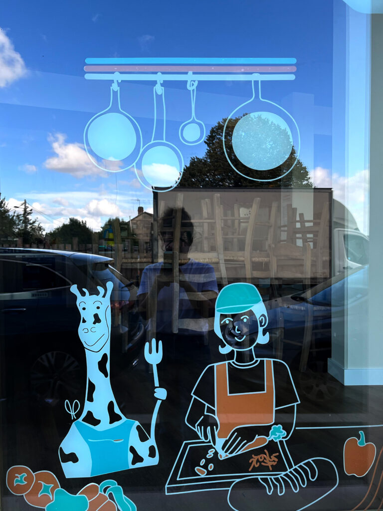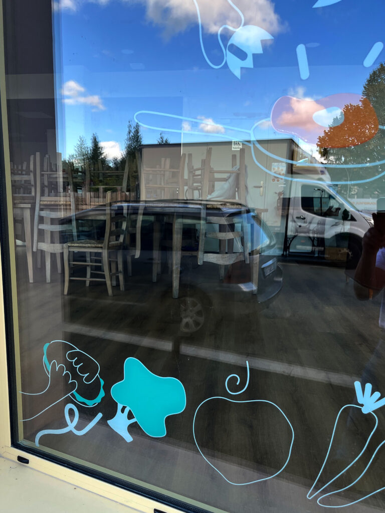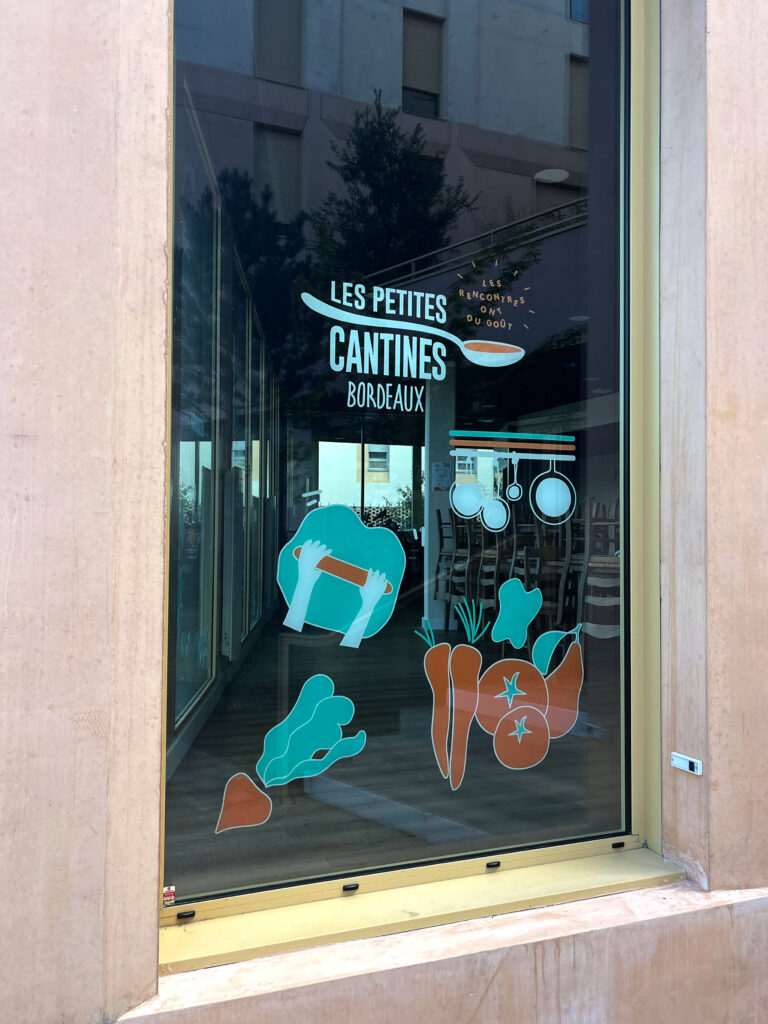 Création d’illustrations, ludiques et attrayantes pour habiller les vitrines du restaurant associatif, Les Petites Cantines (Quartier Belvédère, Bordeaux). Déclinaison d’une charte existante.